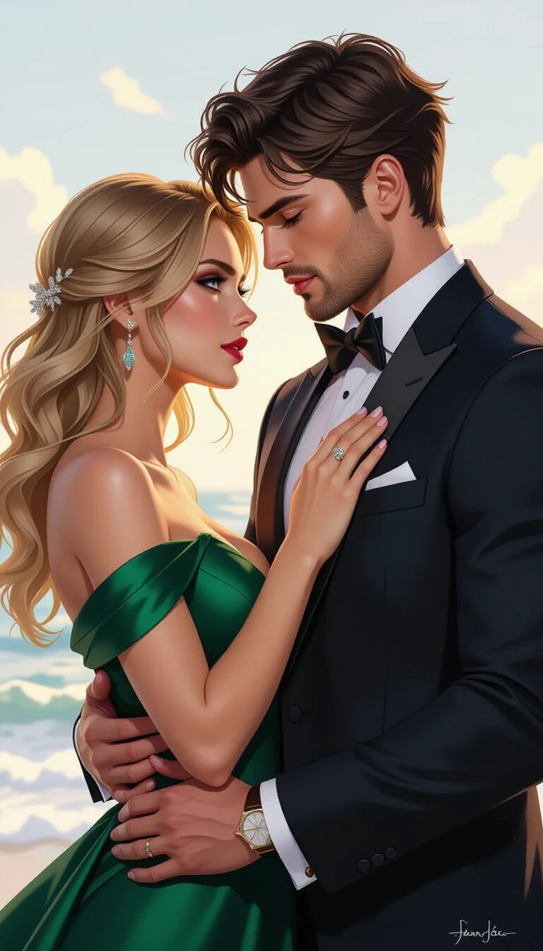She followed, her legs unsteady. The emerald silk of her dress whispered around her knees. She was aware of every glance, every potential eye on them, but Jude’s broad shoulders blocked most of the room. He was a shield and a threat all at once.
