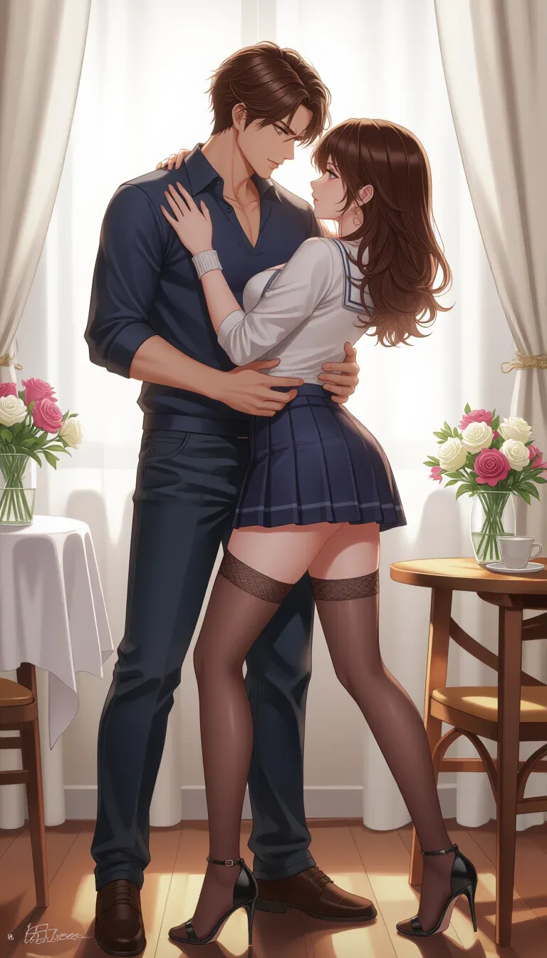 Mickey’s heart hammered against her ribs, a frantic bird in a gilded cage of lace and satin. The schoolgirl skirt was shorter than anything she’d ever owned, the stockings a whisper against her thighs, the heels making her legs endless. She watched Leo’s easy smile freeze, then melt into something dark and hungry as his eyes traveled from her glossy lips down to the desperate arch of her back. Before he could speak, she closed the distance, the taste of her cherry gloss smearing against his mouth as her trembling fingers found the hard line of his cock through his jeans. The world narrowed to his shocked inhale, the heat of his body, and the wet ache between her own thighs that said this was already happening.