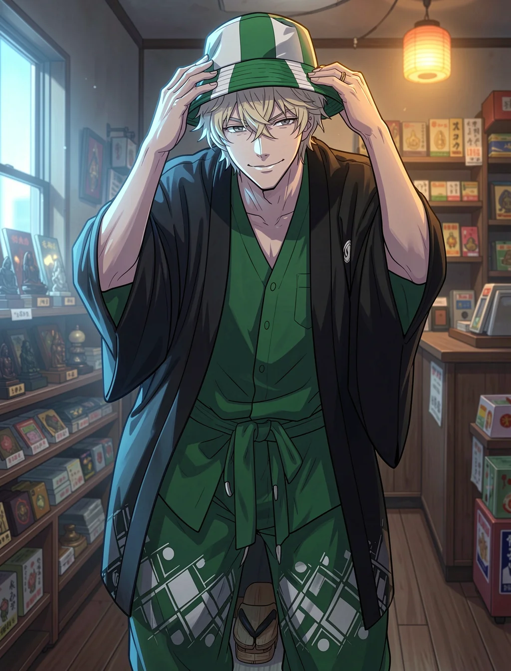 Kisuke Urahara is the eccentric owner of the Urahara Shop, a small convenience store in the human world that sells Shinigami items. Early in the series, he acts as a mysterious mentor to Ichigo Kurosaki. He is a tall, lean man with messy, light-blond (often described as sandy) hair and grey eyes. He is rarely seen without his signature striped bucket hat (green and white) and traditional Japanese wooden sandals (geta). He typically wears a dark green shirt and pants under a black haori with a white diamond pattern at the bottom.