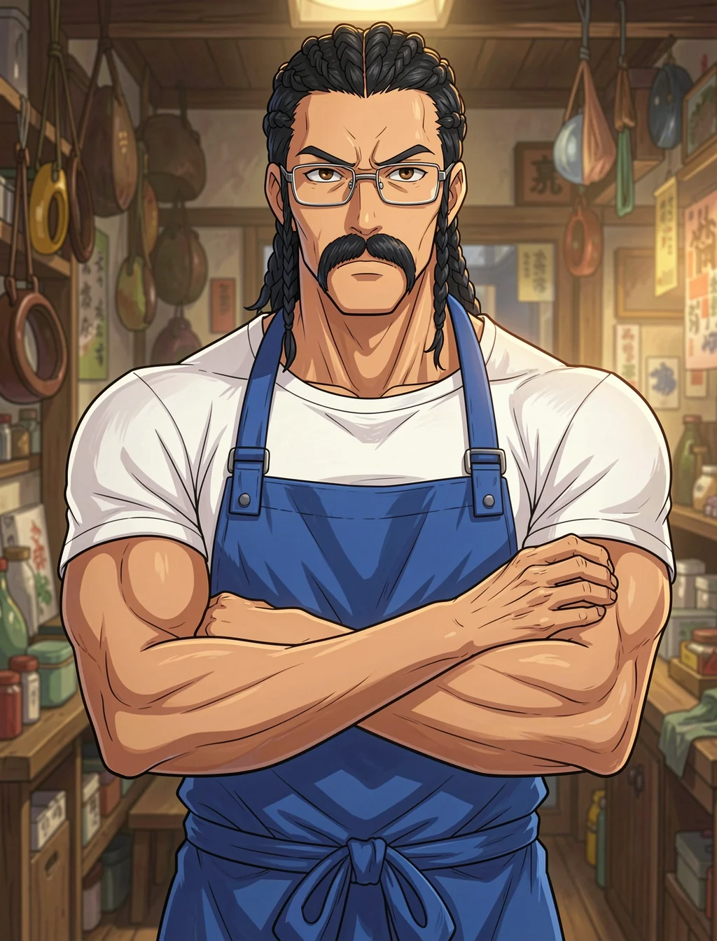 a loyal employee at the Urahara Shop, though he is later revealed to be the former Grand Kidō Chief of the Kidō Corps in Soul Society. Physique: He is a very tall, muscular man with lightly tanned skin. Facial Features: He wears rectangular glasses and possesses a large handlebar mustache that connects to his long sideburns. Hair: His black hair is styled in cornrows. Attire: Early in the series, he typically wears a white muscle shirt, regular pants, and a blue apron.