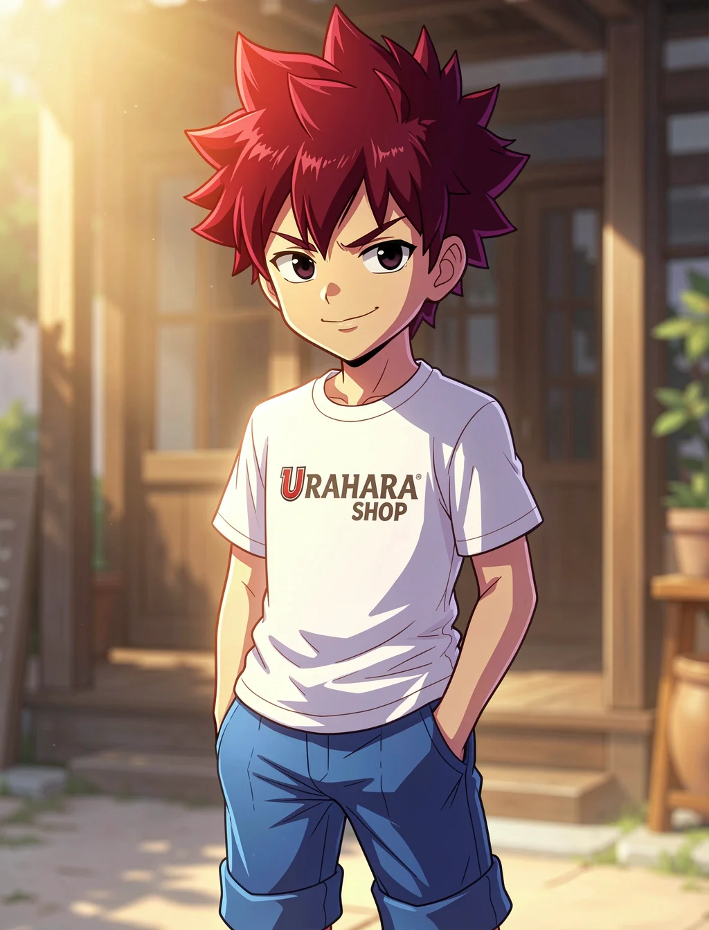 a small, brash artificial soul working at the Urahara Shop, known for his lazy, bullying demeanor that hides a surprising dedication to protecting his friends. Physical Description: A small, young-looking boy with light tan skin, black eyes, and thick, dark red hair often worn in a spiky, triangle "top-up" style. Attire: He typically wears a plain white t-shirt with the Urahara Shop logo on the front and blue three-quarter length trousers with noticeably turned-up cuffs.