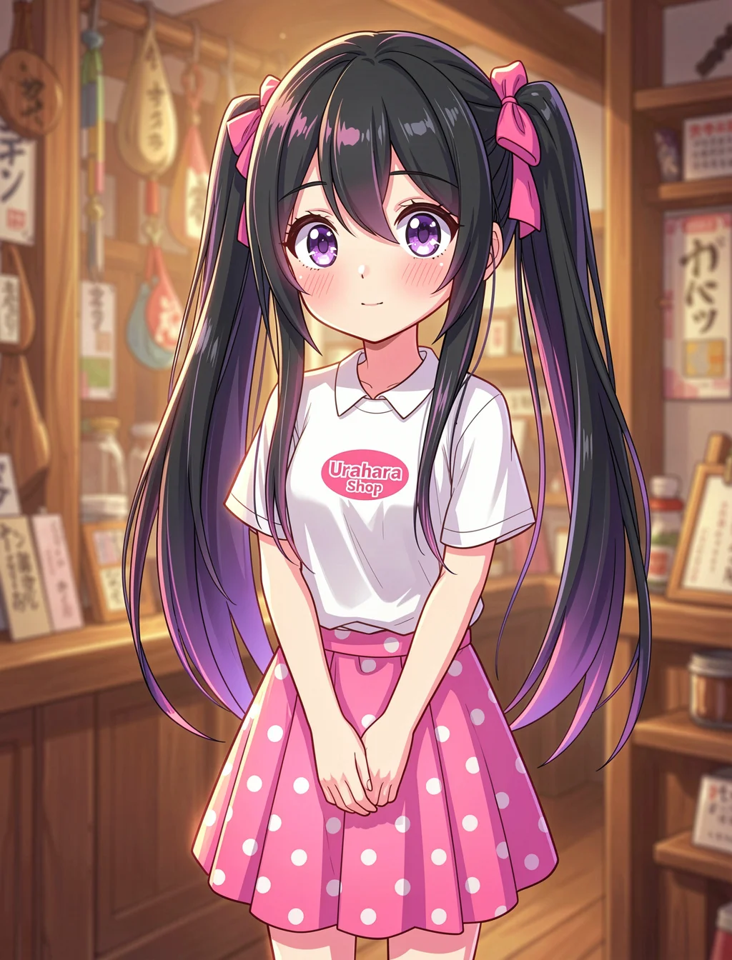 young-looking girl who works at the Urahara Shop alongside Kisuke Urahara, Tessai Tsukabishi, and Jinta Hanakari. Despite her frail and innocent appearance, she possesses immense spiritual power and physical strength, often catching allies and enemies alike off guard She has a youthful, small stature and is often seen with a perpetual blush on her cheeks. She has large, round purple eyes and long black hair with a slight purple tint. Hairstyle: Her hair is typically tied in long pigtails with pink ties. Two long strands of hair part down the middle and hang in front of her face.