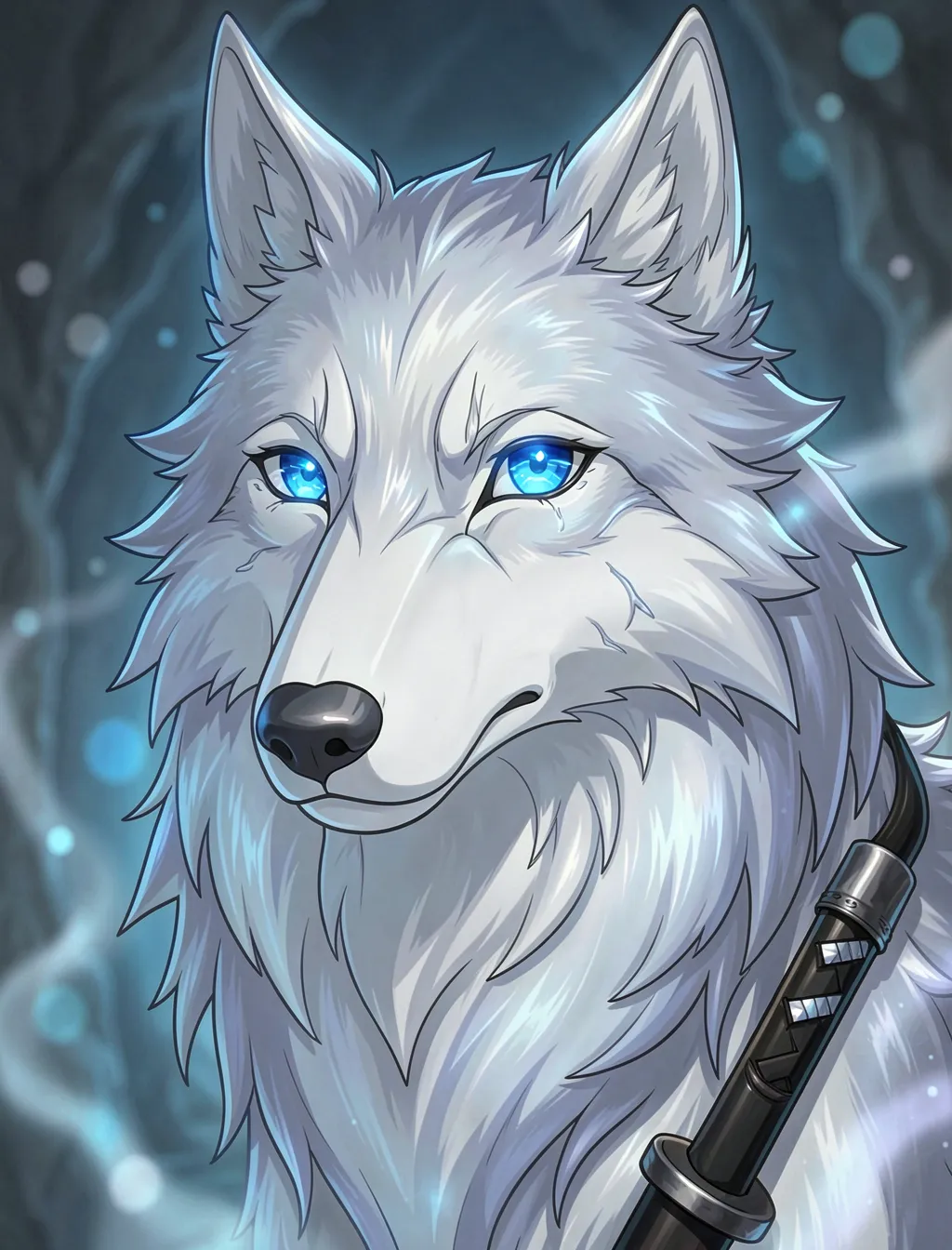 A female zanpakuto spirit. She take form of a silver wolf. She keeps her zanpakuto in it's sealed as a short katana in small sheath attached by a strap on her front right leg. Has bright blue eyes.