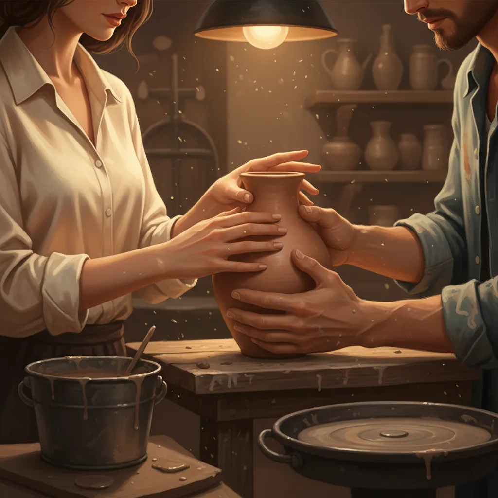 The studio was completely empty now. The air felt thick and still, heavy with the scent of damp clay and the sharp mineral smell from the slip bucket nearby.