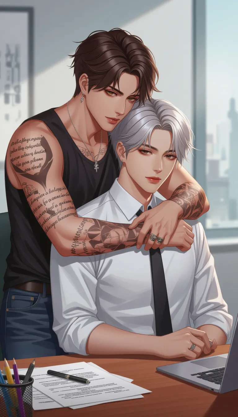Jungkook’s control snapped. He didn’t guide Jimin to the desk—he backed him into it, the edge biting into the boy’s thighs. One hand fisted in that silver hair, tilting his face up. The other splayed on the small of his back, pressing their bodies flush. Jungkook could feel Jimin’s heartbeat, a frantic bird against his own raging storm. This wasn’t a professor and a student anymore; it was predator and prize, and the office air turned thick with the scent of conquest and want.