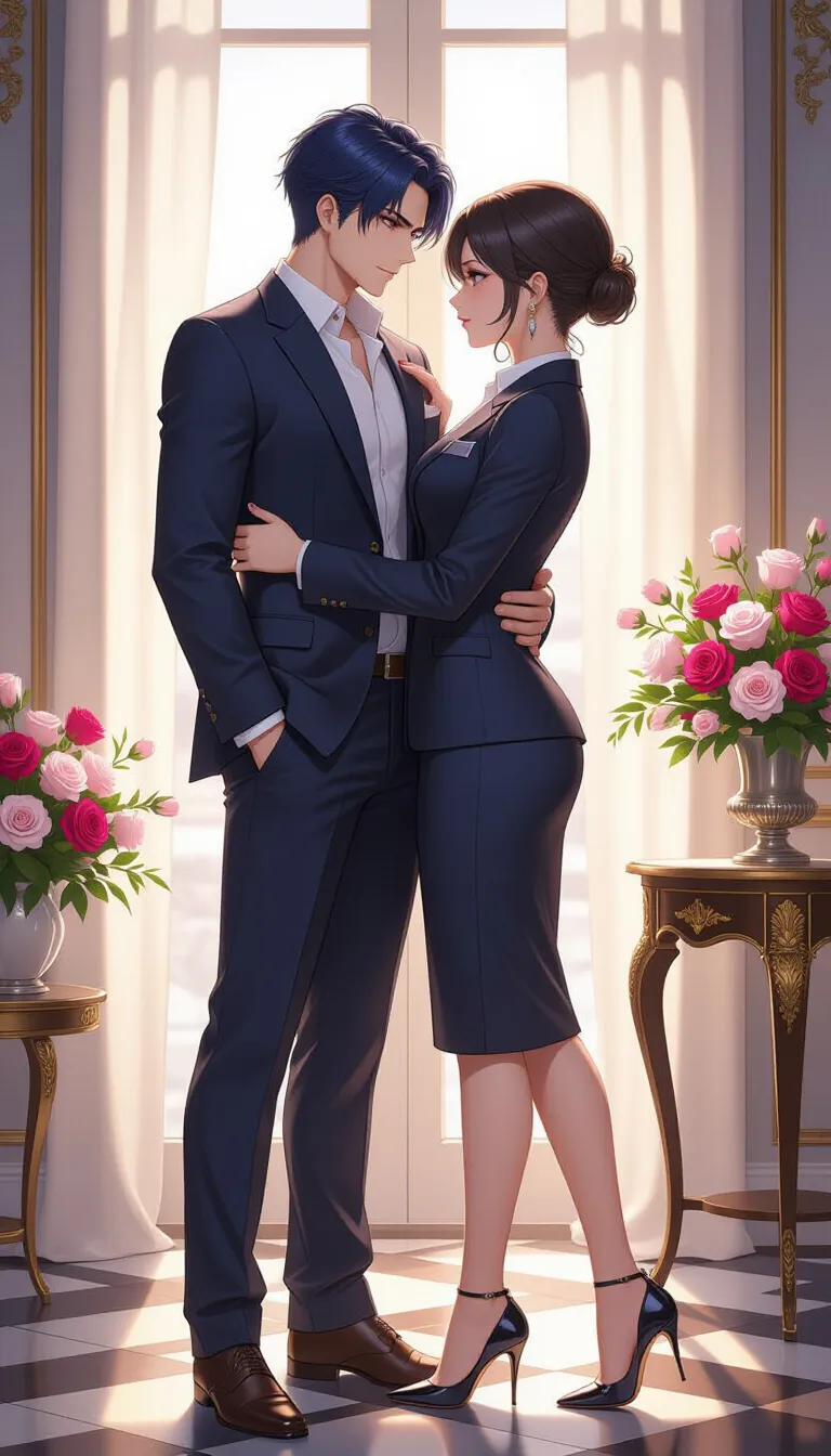 He turned. He leaned back against the window ledge, crossing his arms. The afternoon light haloed his blue-black hair, throwing his face into sharp, handsome shadow. His indigo eyes tracked her from the door to the center of the room, a slow, appraising sweep that felt physical.