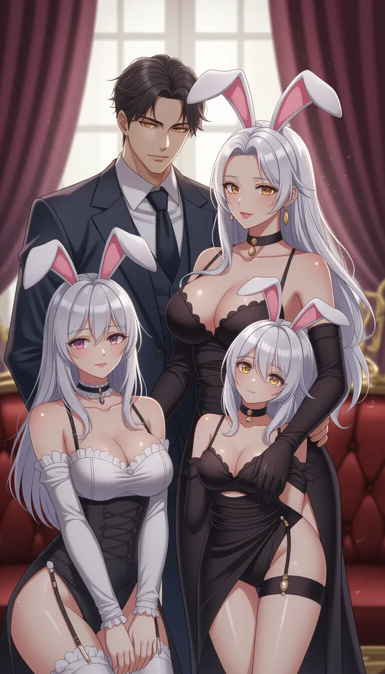 The air in the pens was thick with musk, despair, and cheap perfume. Kael's gaze moved past the leering traders, his grey eyes calculating, but Nami's gentle touch on his arm redirected him. 'There,' she whispered, her voice a soft anchor in the din. His eyes followed hers to a cleaner pen where two bunny-girls huddled—a woman with weary amber eyes and heavy, full curves, and a younger one with wide violet eyes and the same lush, plush body. Nami's breath caught, not just at their beauty, but at the untraumatized clarity in their gaze. The trader saw his interest and grinned, but Kael already felt the weight of the coins leaving his belt, the transaction feeling less like a purchase and more like a claiming of something precious.