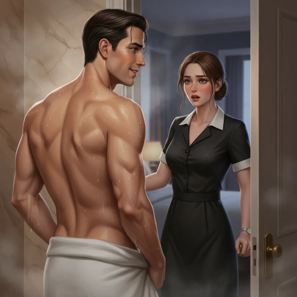 The bathroom door swung inward on a cloud of steam. Ryan froze, one hand clutching the towel at his hips, water tracing the lines of his abdomen. Mia’s gaze, trained to scan for empty glasses and crumpled sheets, snapped up and stuck. Her breath hitched, a flush burning from her collar to her cheeks. The air between them thickened, charged with the shock of his exposure and the sudden, impossible intimacy of the steam clinging to their skin.